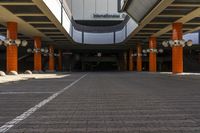 A modern office building in Berlin, Germany. The multicolored facade and straight road create a symmetrical urban landscape. The underground parking deck blends seamlessly with the city's infrastructure.