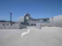 Urban landscape featuring an empty parking lot with a clear sky backdrop. A man riding a skateboard adds a dynamic element to the scene. Tall building in the background adds to the urban design.