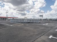 This stock photo portrays a modern urban landscape in Berlin, Germany. The image showcases the city's architecture and city life ambiance. It features a wide asphalt road surrounded by open spaces and trees. The monochrome effect adds depth to the scenery, and the clouds in the clear sky create a sense of tranquility. The road surface is well-maintained, and a fence along the thoroughfare offers safety. The presence of street lights and electricity infrastructure signifies the urban design. In the foreground, there is a parking deck and a parking garage. Overall, this image captures the essence of Berlin's thriving urban environment in Europe.