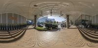 A 360-degree panoramic view of the urban landscape of Los Vegas. Modern architecture and concrete surfaces dominate the cityscape. Shopping malls and storefronts offer a variety of shopping experiences. Open spaces, benches, and elevated views provide a unique perspective of the city.
