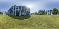a field with a building and some trees in the background and a blurry photo of the reflection of the sky on the windows