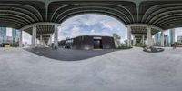 Modern architecture in the heart of Toronto. A concrete bridge and underpass connect the urban landscape. Grey skies reflect on the mirror-like surface of an empty skate park ramp, while people sit and enjoy the view.
