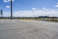 This stock photo showcases an urban landscape view of a parking lot in Toronto, Canada. The image captures the wide open space of the parking lot with a large building and a highway in the background. The asphalt road serves as the main road surface, with clear lanes and street lights. The picture is taken on a sunny day with a clear sky and clouds in the distance. The image showcases the infrastructure and real estate of the suburban area, providing a glimpse of the residential and public space in Toronto, Canada.
