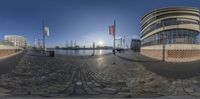 Bremerhafen, Germany: A modern urban landscape with a waterfront view. The high-rise buildings and modern architecture create a striking skyline. Flags flying near the waterway add a touch of patriotism.