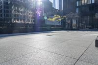 This stock photo showcases the vibrant city life of Toronto, Ontario, Canada. The image features a modern architecture apartment building in a mixed-use neighborhood. Plants are seen growing on the concrete near the city building walls, with one planter displaying beautiful yellow flowers. The bright sunlight creates a pleasant atmosphere, casting shadows on the road surface. The cityscape captures the essence of a bustling metropolis, with high-rise condominiums and office buildings. The urban design and grey facade add to the metropolitan feel. This image represents the dynamic and busy business district of Toronto, while also emphasizing the importance of open spaces and the beauty of nature in an urban environment.