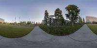 the view from within an outdoor sphere of a field with buildings in the background in a panorama