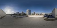 a couple of buildings sitting in the middle of a city sidewalk of skateboarding ramps
