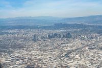 This is an aerial view of the metropolitan area of Los Angeles, California, USA. The photo showcases the modern architecture of the city against a clear sky. Tall buildings and skyscrapers create a stunning cityscape and skyline. The vibrant urban environment is surrounded by trees and green spaces. This image captures the bustling energy and modernity of Los Angeles, an iconic city in the United States.