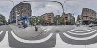 A fisheye view of a vibrant urban neighborhood on a clear day. Colorful graffiti and artistic fonts line the buildings, adding character to the architecture. Trees and vegetation provide a natural touch to the bustling thoroughfares.