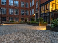 Urban scene in Berlin's business district at night. Classic and modern architecture mix under artificial light. Cobblestone streets contrast with sleek office buildings. A blend of old-world charm and contemporary design.