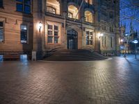 A night scene in the heart of a bustling city. Office buildings with beautifully lit windows create a stunning urban landscape. The dark sky contrasts with the warm glow of streetlights and the busy streets below.