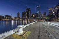 A stunning cityscape at dawn with modern high-rise buildings towering over the city. The straight road leads to a beautiful lake. The artificial light gives a magical glow to the urban landscape.