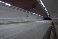 A dark, empty tunnel with concrete walls and a light gray ceiling. The highway inside is lined with metal railings. Artificial lights illuminate the tunnel, creating a mysterious and urban atmosphere.