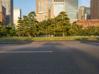A serene morning at Edo Park in Tokyo, Japan. Modern architecture blends with traditional greenery in this urban open space. Tokyo Central Station's skyline provides a dramatic backdrop under a clear sky.