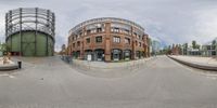 360 - view looking at a parking lot with traffic and buildings in the background of a circular lens view