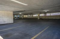 A view of an urban parking garage in Toronto, Ontario. The concrete flooring and asphalt road surface create a composite material texture. The hard shadows cast by the buildings add depth to the urban design.