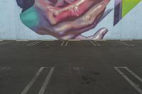 This image captures the vibrant street art scene in the urban area of Los Angeles. A mural showcasing pink graffiti catches the eye, adding a splash of color to the otherwise low-profile residential neighborhood. The snapshot showcases the artistic expression and creativity that is part of city life. The parking lot and parking deck provide a surface for urban design and visual arts. The hand-painted mural on the graffiti wall is a testament to the art district of Los Angeles, where art and culture thrive.