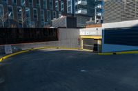 A bird's eye view of an urban parking lot in the heart of Montreal. Modern architecture and office buildings surround the busy city streets. Cars drive along the road, casting hard shadows.