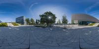 A fish-eye lens captures a unique reflection on a concrete street in Berlin. Modern architecture and urban design dominate the cityscape, while trees provide a touch of nature. The vibrant city life of Berlin comes to life in this urban landscape.