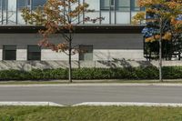 A modern white building with glass windows stands on a street corner in Toronto. The empty sidewalk and clear sky create a serene urban scene. Autumn leaves scatter the road surface, hinting at the changing season.