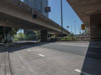 An urban road and bridge with a clear sky above. The road surface made of asphalt and composite material. The cityscape showcases urban design with curbs and underpasses.