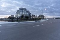 This stock photo features an urban road at dawn in Markham, Ontario, Canada. The architecture of the residential buildings in the town can be seen in the background. The road surface, made of asphalt, curves in an S-shape, creating an interesting visual effect. The sky is grey with clouds, adding a dramatic touch to the scene. A tree stands by the side of the road, providing a touch of nature in this urban setting. The photo captures the infrastructure and public space of this town in Ontario, Canada.