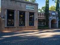 a building is on the sidewalk and has a brick walkway and small trees outside the building