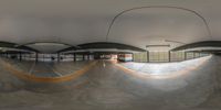 A modern architecture marvel in Berlin, Germany. This indoor skate park features a sleek design with concrete and metal elements. The symmetrical layout and ample natural light create a vibrant urban space for skateboarders. A thrilling view from inside the park in motion.