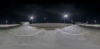 An urban skate park at night, illuminated by floodlights. Empty ramps on either side. The city's clear sky contrasts with the artificial light. A perfect spot for skateboarders and BMX riders.