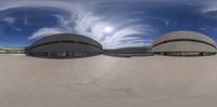 an empty skateboard court has round concrete roofs and a big dome like structure at one end