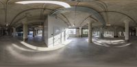 a room with columns and ceilings and arches covered by light reflecting off the windows on the concrete floor