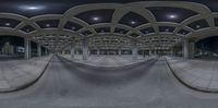 Skateboarder showcasing skills in a monochromatic urban space. Concrete and arches create a unique architectural design. Overhead perspective offers a captivating view of tricks being performed.