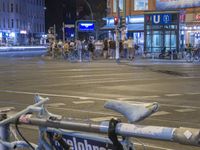 Nighttime scene in Berlin, Germany with classic architecture buildings. Bicycles parked in the foreground, people waiting to cross the street. Artificial street lights illuminate the city's asphalt roads.