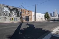 This is an image of a suburban neighborhood in Los Angeles, California, USA. The clear sky and sunny day highlight the classic architecture of the residential buildings. The asphalt road and road surface curve through the low-rise neighborhood, casting long shadows. Vibrant graffiti adorns the walls, adding a unique touch to the urban landscape. This photo captures the essence of city life in Los Angeles, showcasing the urban design and the art district of the town.