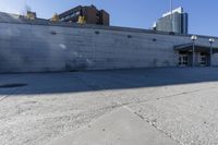 This captivating stock photo captures the urban landscape of Toronto, Ontario, Canada. In the foreground, the shadows from a high-rise building stretch across the pavement, creating dramatic patterns. The cityscape, with its modern concrete structures and open spaces, is visible in the background. The clear blue sky and bright sunshine enhance the beauty of this scene. This photo showcases the architectural beauty of Toronto and its urban environment.