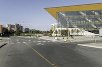 A modern office building in the financial district of downtown Toronto, Canada. The clear sky highlights the sleek design and composite material facade. Busy city life with pedestrians and vehicles on the asphalt road.