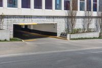 This stock photo features an empty street in the urban landscape of Toronto, Ontario. The street is lined with a large building that has no windows on it and is surrounded by vegetation. A long driveway leads to the entrance of the building. The road surface is made of tar and composite material, creating a smooth asphalt. The facade of the building is modern and features a glass wall. This image captures the essence of city life in Toronto, showcasing the urban architecture and design. It is suitable for illustrating concepts related to urban living, residential areas, and modern architecture in the Canadian city of Toronto.