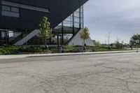 This stock photo shows a view of Toronto's financial district, with a modern office building standing on a street corner. In the foreground, there is a curb and some vegetation, including grass in the center. The road surface is made of asphalt, and the clear sky above is adorned with clouds. This urban scene captures the essence of city life in Canada, showcasing the city's architecture and urban design. The photo was taken during the day, highlighting the modern architecture and bustling business district that makes Toronto a vibrant and dynamic city.