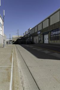 This image captures an empty street in Toronto, Canada. The clear sky above contrasts with the industrial factory building and the residential houses in the distance. The road surface, lined with street lights and windows from the houses, creates an urban landscape. The suburban area is quiet and motionless, emphasizing the solitude of the street. This picture showcases urban design and the balance between residential and industrial areas. It represents a typical day in the suburbs of Toronto.