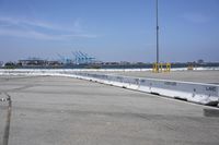 A clear sky over the coastal city of Los Angeles, California. Asphalt roads lined with guard rails lead to the Long Beach pier and industrial factories. A perfect vacation spot for architecture enthusiasts.
