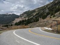 Rural Colorado landscape featuring a winding asphalt road against a backdrop of majestic mountains and cloudy skies. The road curves through nature, depicting a typical day in the USA.