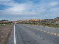 A scenic road cutting through the breathtaking landscape of Utah. The asphalt road winds its way through mountains, with clear skies and fluffy clouds above. Experience the beauty of nature in the USA.