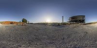 An aerial view of a construction site in the USA, with a clear sky and the sun shining brightly. The building is surrounded by open space and dirt areas, with equipment and gravel scattered throughout. The low profile shadow adds depth to the scene.