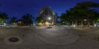 a view through a fish eye lens at night time with buildings and trees in the background