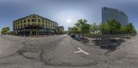 a full view of a street with people walking and trees outside, in a fish eye picture