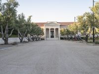 A classic example of California architecture in Los Angeles. Straight down the road, lined with residential buildings and villas. Clear sky overlooks the suburban landscape filled with trees and vegetation. A perfect day to explore historic hotels and museums.