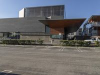 This is an image of a modern architecture building in Los Angeles, California, USA. The building's facade stands out against the clear blue sky, showcasing the unique design and urban features of the city. In the foreground, there is a parking deck and asphalt road, representing the bustling city life and the convenience of transportation. The open spaces and concrete surfaces create a contemporary and vibrant atmosphere. This photo captures the essence of the urban design and architectural beauty of Los Angeles, making it a popular tourist attraction and desirable real estate location.