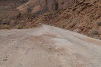 This is an image of a rugged landscape in Canyonlands, Utah, USA. The red rock formations and rock walls create a stunning backdrop. The straight road surface leads the viewer's gaze down the road, revealing the beauty of the desert. The dirt and gravel track adds to the natural appeal of the surroundings. The day is bright, showcasing the vibrant colors of the landscape. This photo captures the essence of the off-road experience in Utah's desert terrain.