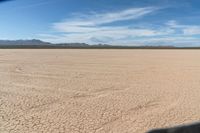 This image captures the vast open space of the arid desert in the USA. The dry grass and dirt roads create a desolate landscape under a clear blue sky. In the distance, majestic mountains rise above the surface, adding to the sense of grandeur and isolation. This photo represents the beauty and stillness of the desert, with its wide expanse and untouched nature. It encapsulates a typical day in the desert, with the sun shining and the clouds lazily drifting through the sky.