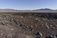 A breathtaking view of the rugged California desert landscape, featuring mountains and an open expanse of dirt and gravel roads. The clear sky above highlights the high rock formations and the elevated volcanic crater of Pisgah.